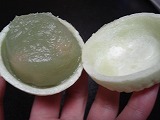 中には薄緑色の餡と白い豆が!ちゃんとほんのりメロン味がして上品な甘さで